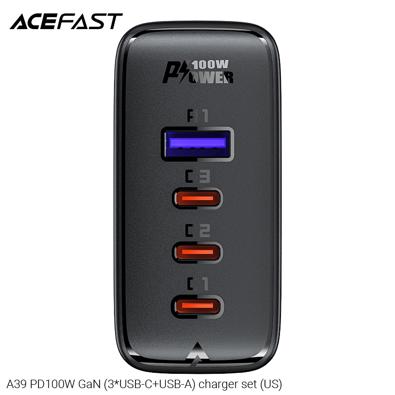 Sạc ACEFAST A39, 4 cổng 2xUSB-C + USB-A PD100W, phích cắm US, hỗ trợ hầu hết các giao thức sạc nhanh.