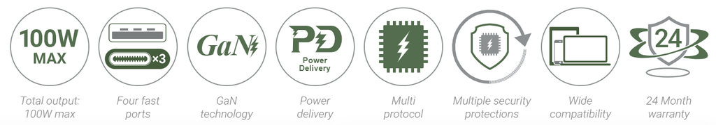 - USB-C2: 3.3V-21V⎓5A (PPS), 5V⎓3A, 9V⎓3A, 12V⎓3A, 15V⎓3A, 20V⎓5A - tối đa 100W.