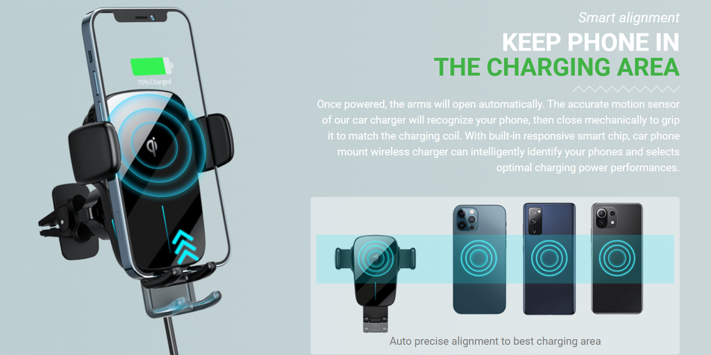 Sau khi được cấp nguồn, các cánh tay sẽ tự động mở ra. Cảm biến chuyển động chính xác của bộ sạc trên ô tô của chúng tôi sẽ nhận ra điện thoại của bạn, sau đó đóng lại bằng cơ học để kẹp nó khớp với cuộn dây sạc. Với chip thông minh đáp ứng tích hợp, bộ sạc không dây gắn điện thoại trên ô tô có thể nhận dạng điện thoại của bạn một cách thông minh và chọn hiệu suất sạc tối ưu.