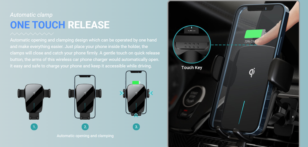 Thiết kế mở và kẹp tự động có thể được vận hành bằng một tay và giúp mọi thứ dễ dàng hơn. Chỉ cần đặt điện thoại của bạn vào bên trong giá đỡ, các kẹp sẽ đóng và bắt điện thoại của bạn một cách chắc chắn. Chỉ cần chạm nhẹ vào nút mở nhanh, tay của bộ sạc điện thoại không dây trên ô tô này sẽ tự động mở ra, thật dễ dàng và an toàn để sạc điện thoại của bạn và luôn có thể truy cập được khi đang lái xe.