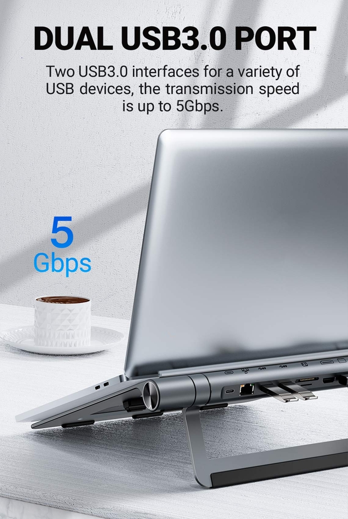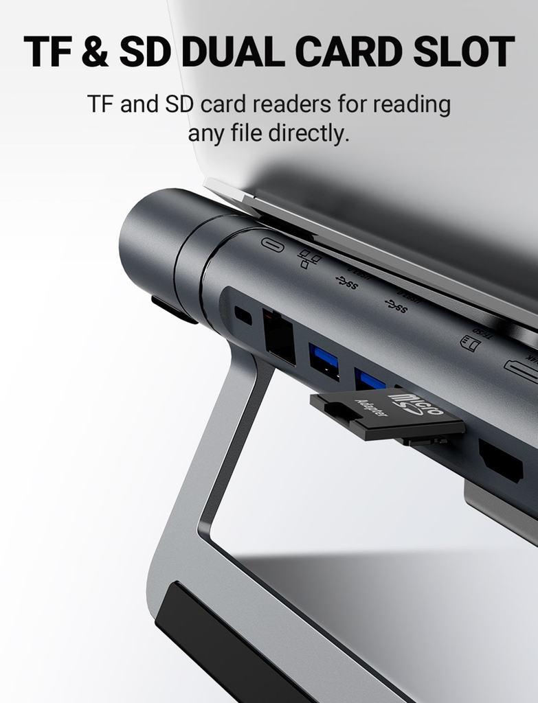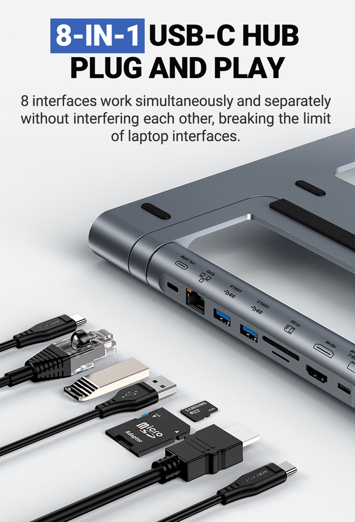- Cổng Hub USB-C 8 in 1: 8 cổng hoạt động đồng thời và riêng biệt mà không ảnh hưởng đến nhau hay phá vỡ giới hạn của laptop