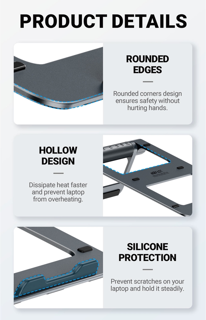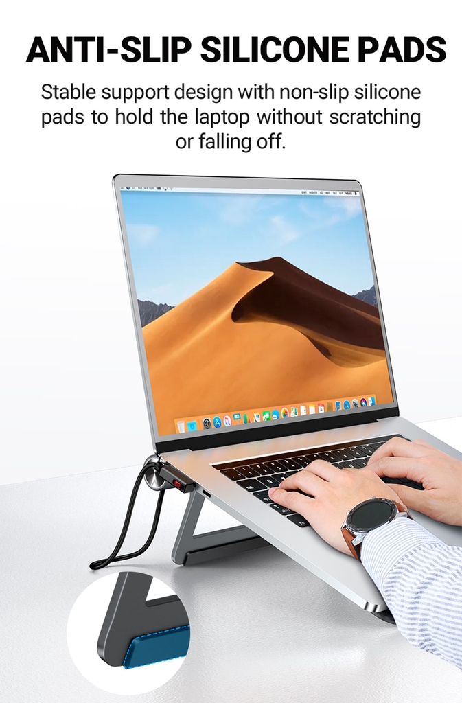 - Đệm silicon chống trượt khi để giá đỡ trên mặt phẳng và tránh trầy xước, làm trượt khi giữ laptop