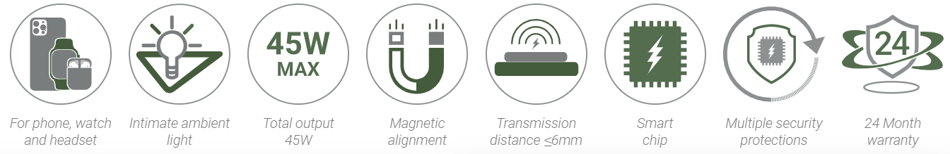 *Lưu ý: Đế sạc phù hợp với các thiết bị có hỗ trợ sạc không dây, riêng chức năng sạc Magsafe chỉ hỗ trợ cho các dòng từ iPhone 12 series trở lên và các dòng tai nghe có hỗ trợ sạc Magsafe. Lực hút từ tính chỉ hỗ trợ tốt khi sử dụng ốp lưng có độ dày <=5mm