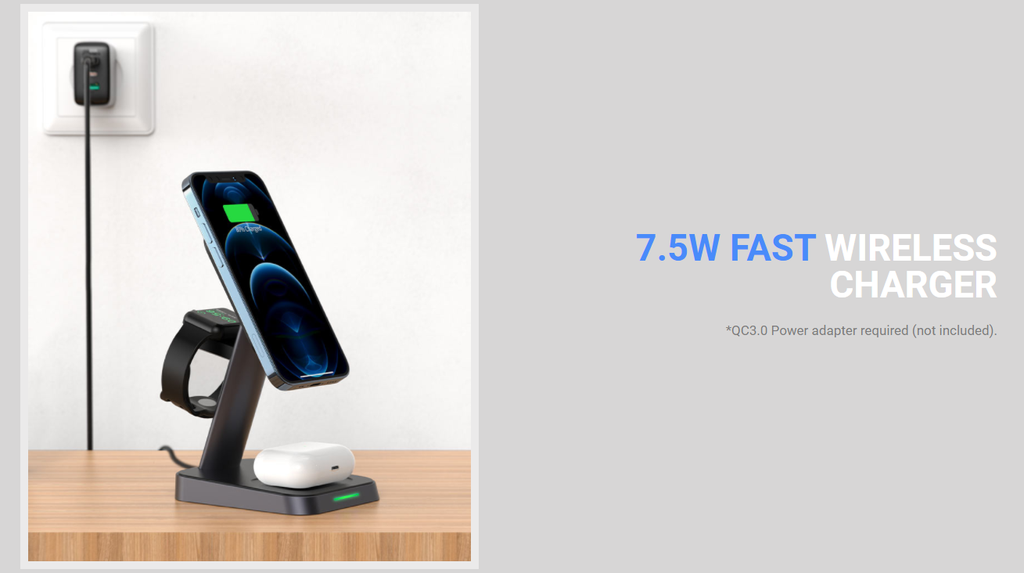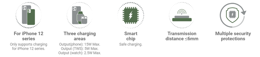 - Tính năng 1: Sạc nhanh đồng thời điện thoại di động / tai nghe / đồng hồ, tương thích với điện thoại di động từ dòng iPhone 12 series trở lên.