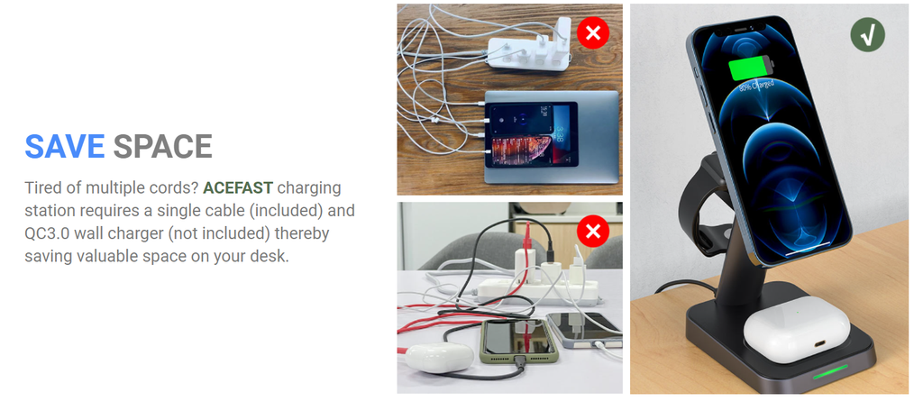 Bạn mệt mỏi với nhiều dây? Đế sạc ACEFAST yêu cầu một cáp duy nhất (có kèm theo trong hộp sản phẩm) và bộ sạc gắn tường QC3.0 (không kèm theo trong hộp sản phẩm), nhờ đó tiết kiệm không gian trên bàn làm việc của bạn.