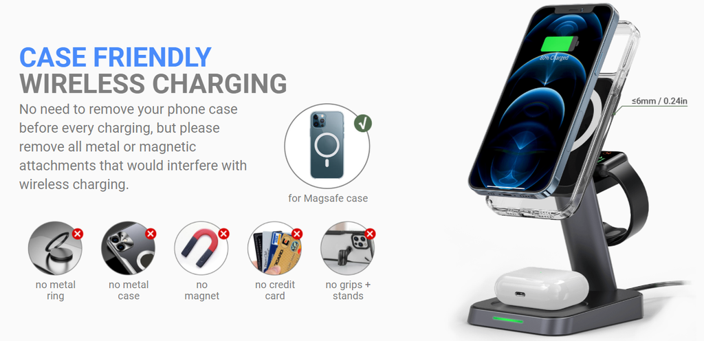 *Lưu ý: Đế sạc phù hợp với các thiết bị có hỗ trợ sạc không dây, riêng chức năng sạc Magsafe chỉ hỗ trợ cho các dòng từ iPhone 12 series trở lên.