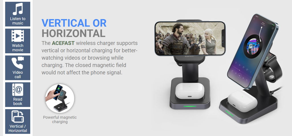 Bộ sạc không dây ACEFAST hỗ trợ sạc dọc hoặc ngang để xem video hoặc duyệt web tốt hơn trong khi sạc. Từ trường sẽ không ảnh hưởng đến tín hiệu điện thoại.