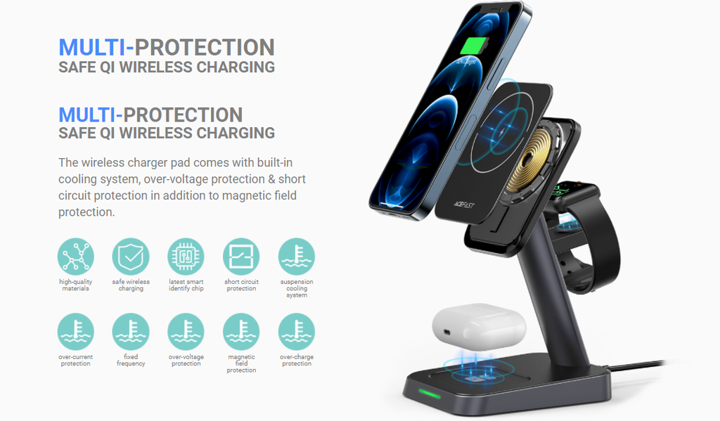 Đế sạc không dây đi kèm với hệ thống làm mát được tích hợp, bảo vệ quá áp & bảo vệ ngắn mạch ngoài, bảo vệ từ trường.