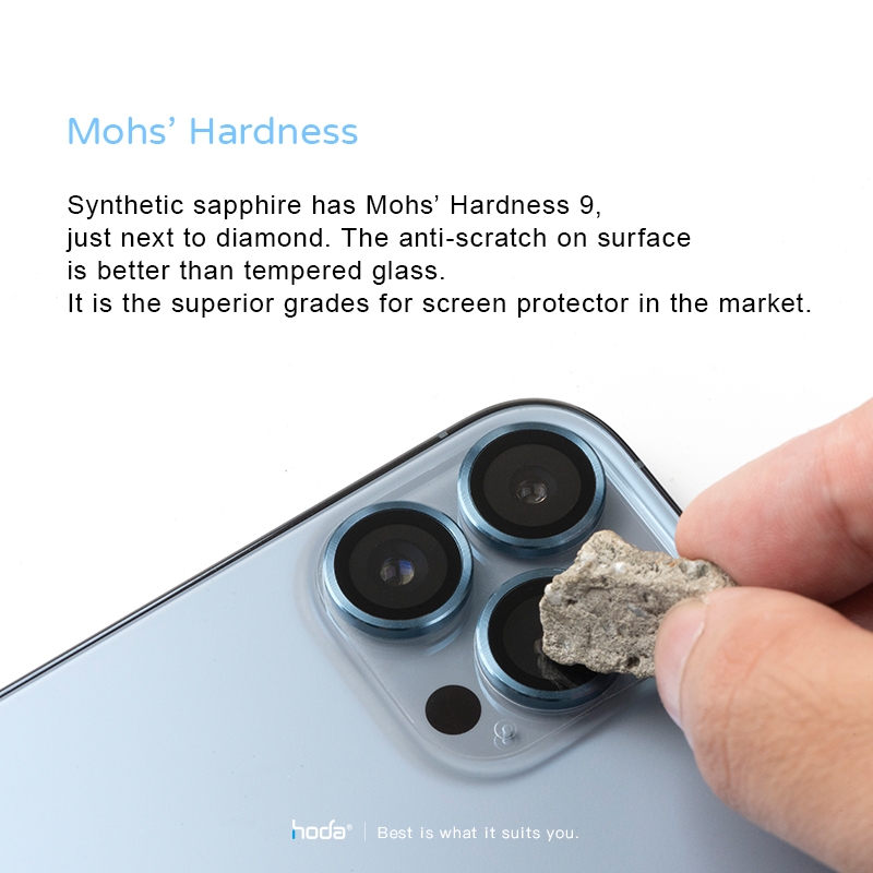 Sapphire tổng hợp có độ cứng 9H chỉ xếp sau Kim cương. Chống trầy xước tốt hơn kính cường lực thông thường. Đây là miếng dán cường lực cao cấp trên thị trường.
