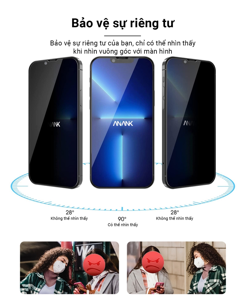 ANANK Privacy bảo vệ màn hình của bạn khỏi những con mắt tò mò, trầy xước, hư hỏng do vỡ. Chúng tôi đã thêm bộ lọc hai chiều vào khả năng bảo vệ màn hình bằng kính mạnh nhất, tiên tiến nhất của mình. Vì vậy, bạn sẽ có được sự riêng tư ở góc toàn màn hình khi nhìn từ bên cạnh. Và chúng tôi đã cập nhật góc riêng tư từ 35 ° lên 28 ° angel, một công nghệ mang tính cách mạng, bảo vệ tối đa quyền riêng tư của bạn.