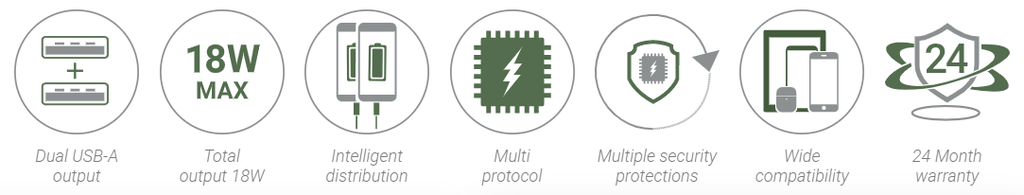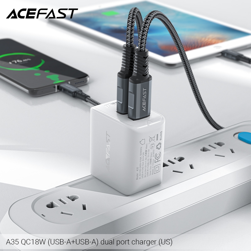 Sạc ACEFAST A35, 2 cổng USB-A QC18W, phích cắm US, hỗ trợ hầu hết các giao thức sạc nhanh.