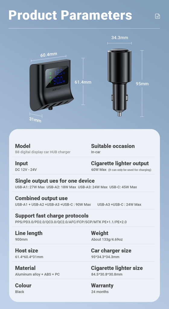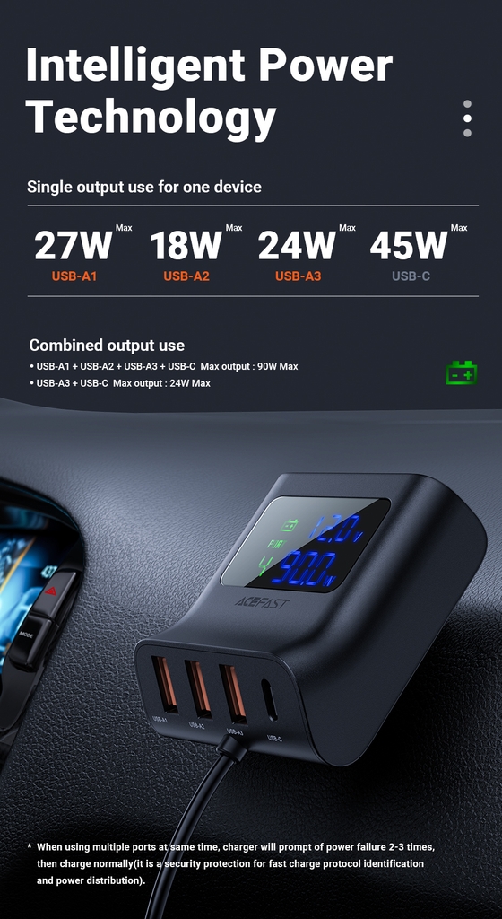 Bộ sạc ô tô ACEFAST B8, tổng công suất 90W, vật liệu thân bằng hợp kim nhôm với màn hình led hiển thị.