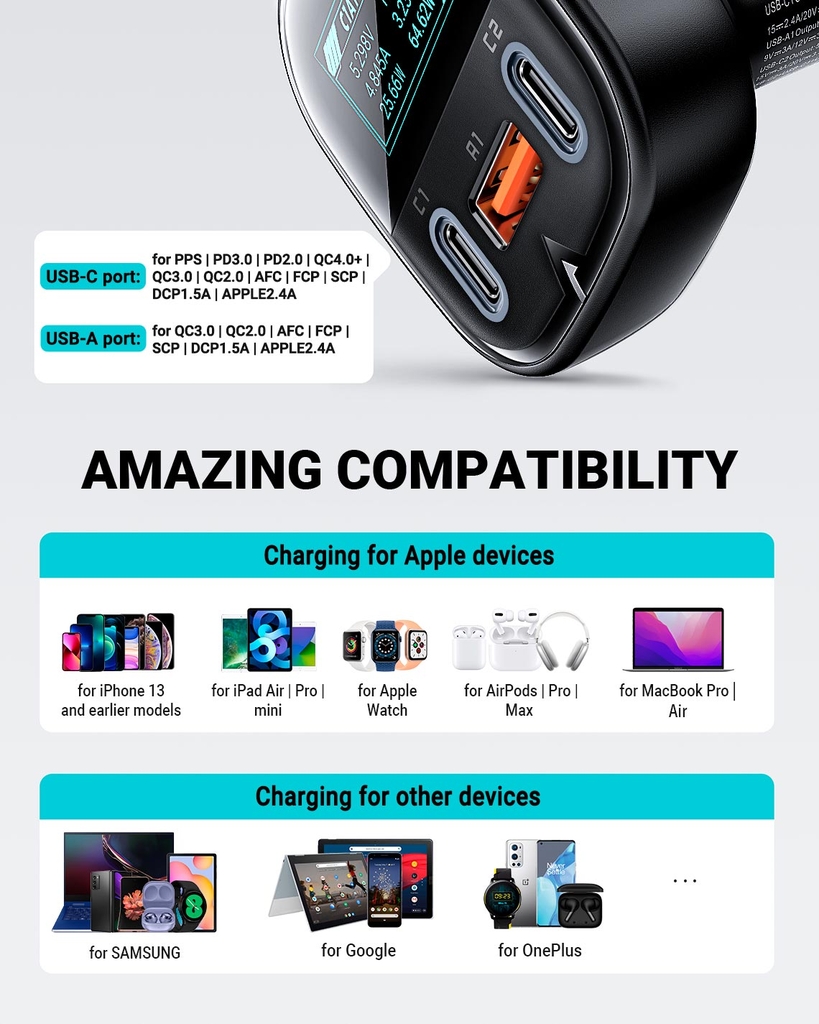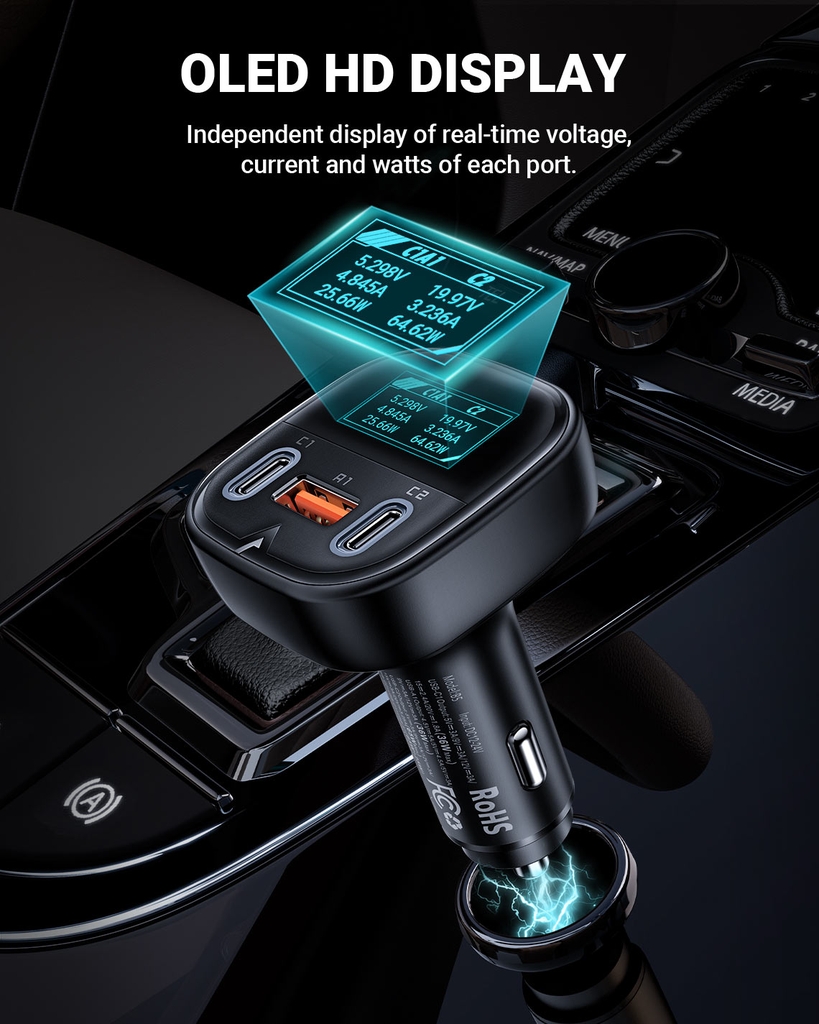 Sạc ô tô ACEFAST B5, tổng công suất 101W, vật liệu thân bằng hợp kim nhôm với màn hình led hiển thị.