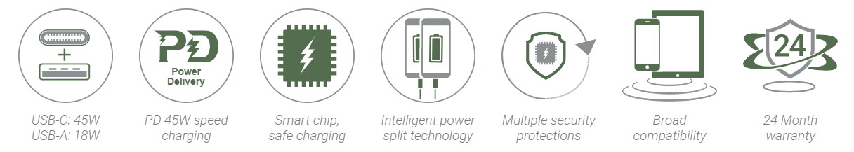 USB-A + USB-C: 18W + 45W (điện áp đầu vào 24V).