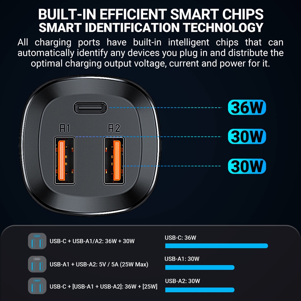 USB-C + USB-A1 / A2: 36W + 30W.