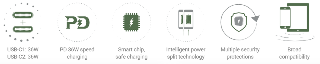USB-C2: 5V / 3A, 9V / 3A, 12V / 3A, 15V / 2.4A, 20V / 1.8A, 36W.