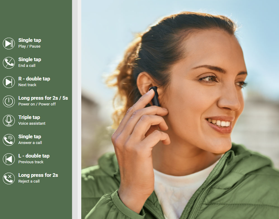 Ghép nối đơn giản và điều khiển dễ dàng chính xác. Thiết kế tiện dụng làm cho nó trở thành tai nghe không dây nhẹ, nhỏ và thoải mái. An toàn và hoàn hảo để chạy, leo núi, yoga và các bài tập thể dục cường độ cao khác.